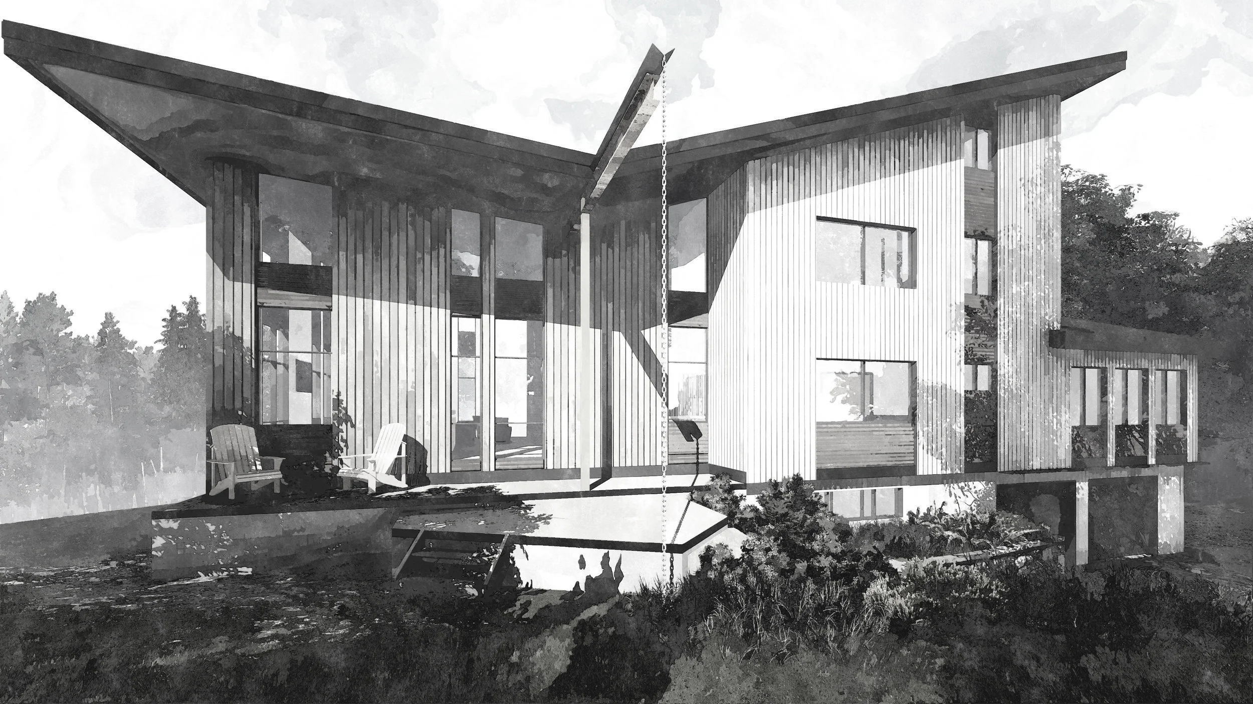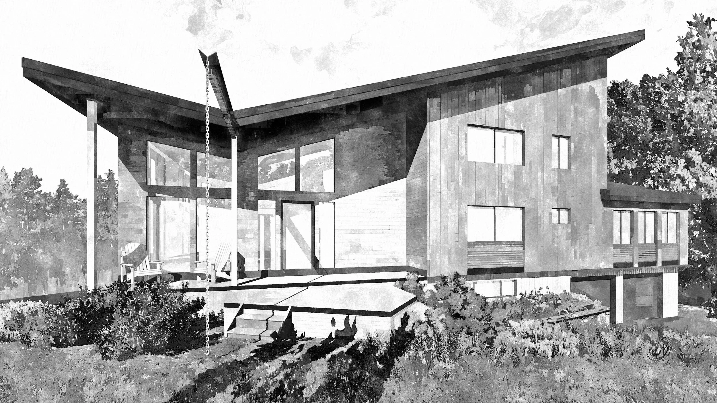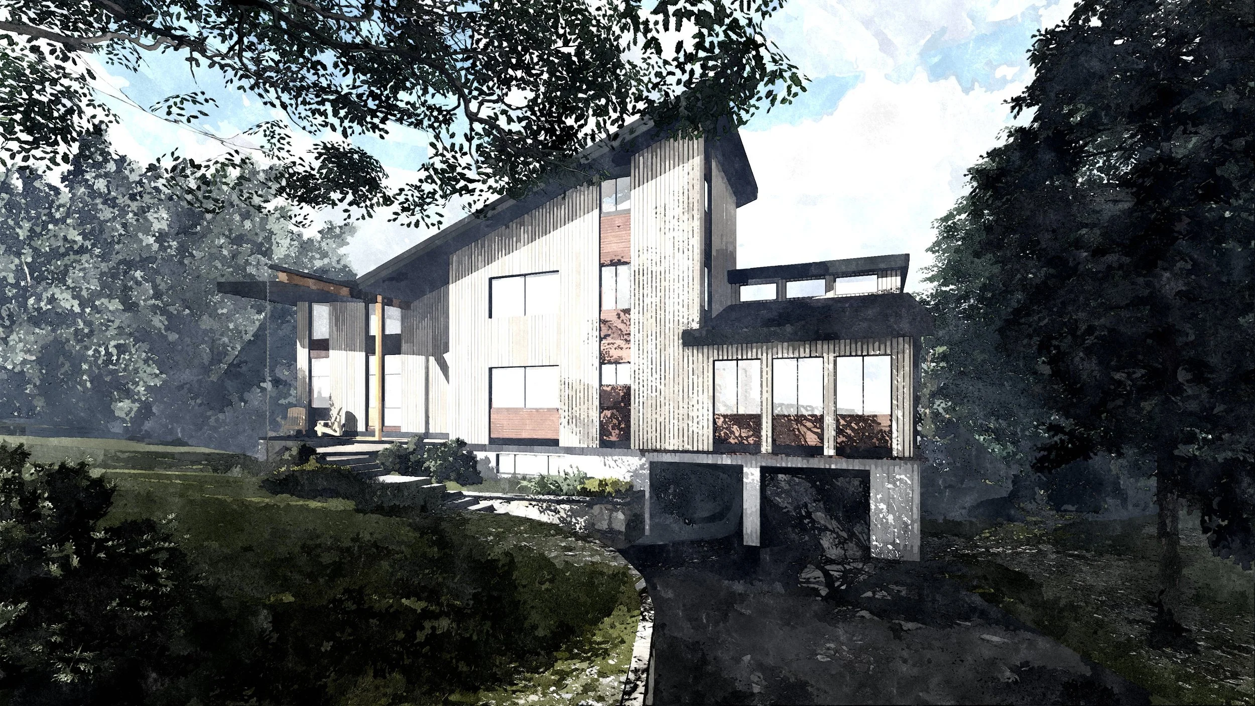 For our first pass at the design, we looked to emphasize the view and entrance of the home (left side of the image) by altering the pitch of the existing roof and creating a “butterfly” roof. Additionally, small enhancements to the existing windows (right side of the image) help to tie the composition together.